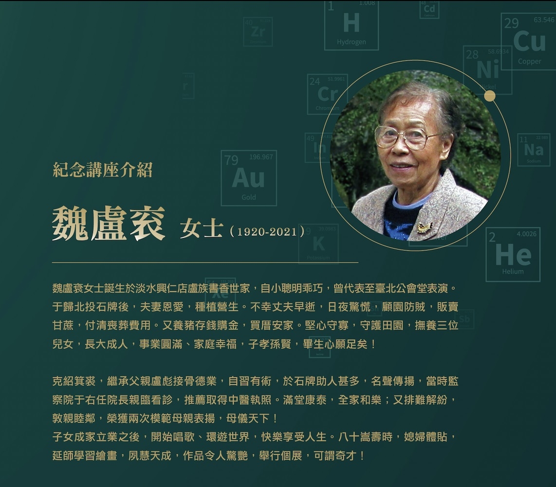 化學系呂家榮教授指出,設立講座的魏義元博士,因父親早逝,由母親魏盧衮獨自撫養三位子女,靠著販售甘蔗和養豬維持生計,最後憑著勤儉持家買了房子,同時魏義元母親見義勇為、與人和睦的個性,不僅幫助眾多鄉親,還考取中醫師執照,替民眾看病,連時任監察院長于右任也慕名看診,並兩度榮獲模範母親表揚。魏義元為紀念母親的堅毅精神,捐款設立此講座,盼學子在面對人生困難時能不懈努力,最終收穫才能有甜美果實。(撰文:公事中心楊詠盛 / 編輯:胡世澤 / 核稿:鄧麗君)