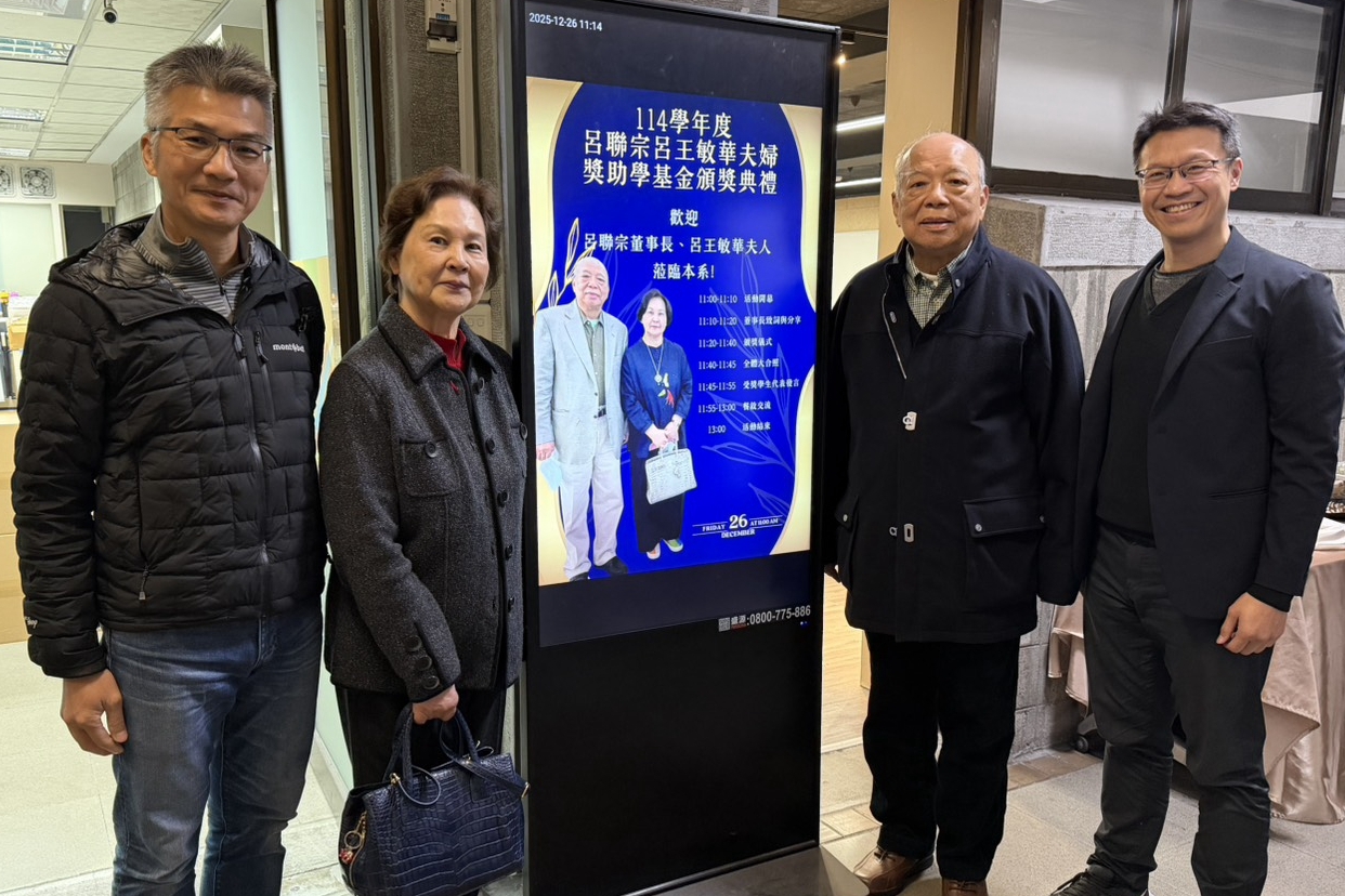 呂聯宗學長隨後勉勵獲獎學生,分享設立獎學金的初衷,期盼同學在接受幫助的同時,能記得來時的起點,並在未來有能力時,將這份善意持續傳承。他也透露,未來規劃擴增獎助範疇,納入教師學術研究發表與學生英語能力培養等面向,期待從教學、研究與人才培育多管齊下,為母系發展注入更長遠的動能。